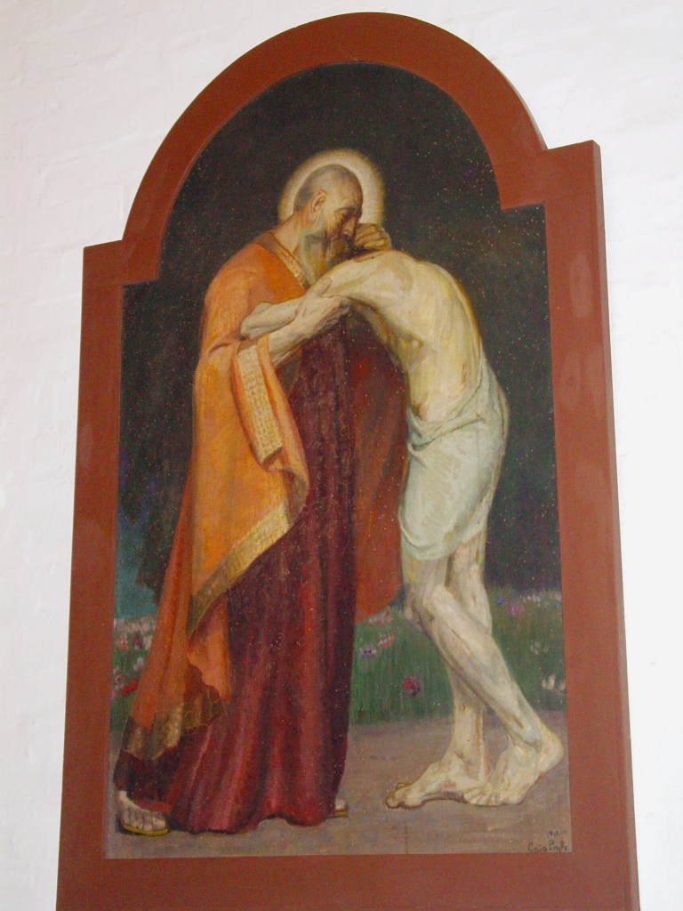 En af de inderligste danske billedtolkninger af Den fortabte søns hjemkomst skyldes den symbolistiske kunstner Caja Prytz (1877-1916), en officersdatter, der som de fleste af tidens kvindelige pionerer var ugift. I 1910-11 malede Caja Prytz sin billedprædiken på væggen i Sjørring Kirke, ved Thisted. Caja Prytz har også malet altertavlen til Hou Kirke. Foto: Claus Jensen.
