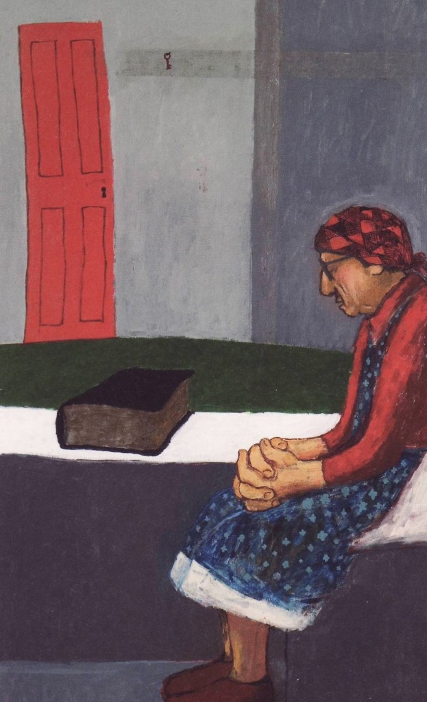 Den færøske kunstner Sigrun Gunnarsdottir er som en ældre færing præget og båret af generationers kristne socialisering, som vi i et mere sekulariseret Danmark typisk må se langt efter. Det giver både frihed og dybde i hendes kunstnerisk-religiøse symbolsprog. Det er således ingen tilfældig detalje, når ”Nøglen” er titlen på et af hendes malerier fra 2002, som jeg her viser et udsnit af. En uanselige nøgle hænger på væggen ved siden af en rød dør. Der kan associeres til, at Jesus iflg. Johs. kalder sig selv for ”døren”. Til højre for døren ser vi aftegningen af et kors. Bedstemor indtager her en nøglerolle, idet hun nærer sin tro ved bøn og læsning i en stor, tung bibel. Et delvist lignende maleri af Sigrun Gunnarsdottir hedder ”Døren”. Der genser vi bedstemor i rummet med den røde dør og nøglen på væggen, men her er biblen lagt til side, erstattet af en lille, lysgul fugl som magisk håbssymbol. Fuglen er næsten et signaturmotiv i Sigruns religiøse kunst. Billederne er fundet i bogen ‘Sigrun Gunnarsdottir’, der kan købes på Galleri Emmaus i Haslev og på Nordatlantens Brygge i Kbh., hvor Sigrun Gunnarsdottir er aktuel med udstillingen ”Vingefang”.