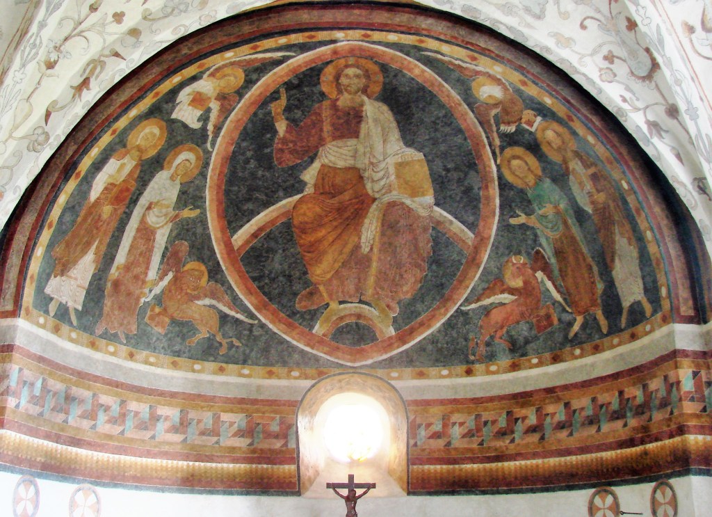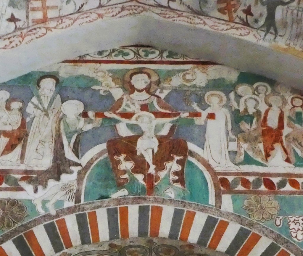 Kirkekunstens traditionelle billeder af Gud som verdenshersker og -dommer gennemgår en historisk udvikling fra den kejserligt-byzantinske Pantokrator og den romanske Majestas til de mange særlig gotiske skildringer af Kristus som Verdensdommeren ved de dødes opstandelse. Verdensherskeren er ofte i første række flankeret af især to bedende mennesker: på den ene side Johannes, der appellerer til retfærdighed, på den anden side Maria, der beder for barmhjertighedens sejr. Dertil engle og de fire apokalyptiske livsvæsner/evangelistsymboler. I navnlig gotisk kirkekunst ses ofte såvel ”retfærdighedens sværd” som ”nådens lilje” udgå fra den himmelske dommers mund. Billedet er forståeligt som dogmatisk symbol, men akavet som gestalt, og motivet frister ikke nyere kunstnere. Her viser jeg først udsnit af et romansk Majestasbillede fra apsis i Sæby Kirke, Kalundborg, hvor apostelfyrsterne Peter og Paulus står bag hhv. Maria og Døberen. Hvor skadet og restaureret kalkmaleriet fra o. 1150 end er i dag, minder det endnu om skønheden i den udmalede romanske udsmykning, hvor verdens Herre æres på sin himmelske baggrund af dybblå lapis Lazuli. Sidst viser jeg et udsnit af et kalkmaleri fra o. 1300 på triumfvæggen i Keldby Kirke, Stege. Iflg. kunsthistoriker Sissel Plathe er dette DKs ældste, bevarede eksempel på et domsmotiv, som omfatter både retfærdighedens sværd og nådens lilje. Her er Alherskeren hele Treenigheden, idet Faderen som Nådesfader fremviser sin korsfæstede Søn, og Helligånden dertil indgår imellem dem. Omkring den centrale skikkelse knæler et udvalg af katolske helgener i bøn og tilbedelse. Fotos: Claus Jensen.
