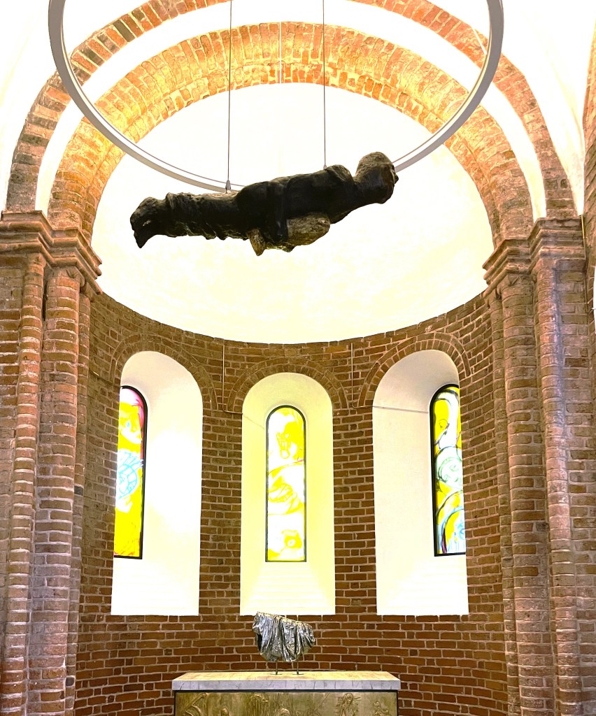 Kunstnere har kæmpet med meget forskellige forestillinger om Lazarus’ opvækkelse og hans liv derefter. Salmekunstneren Lars Busk Sørensen har digtet uendeligt smukt i salmen ’Lazarus i morgenlyset’ om opvækkelsen som et sjæleligt under, hvor Lazarus erfarer en fornyet, lattermild livsfølelse med glæde over sine søstre, naturens liv og det almindelige skabte liv. – Billedkunstneren Peter Brandes har iflg. sine værker i fx Vejleå Kirke derimod forestillet sig, at det var smertefuldt for Lazarus at blive kaldt tilbage til tilværelsen på jorden, voldsomt som at blive født. Edvard Munchs maleri Skriget har her været Brandes’ inspiration. Brandes’ seneste fortolkning af Lazarus’ opvækkelse finder vi i Aarhus Domkirkes ndr. kapel. Kapellets solgule ruder skal med lette ansigtsskitser vise, hvilket syn der mødte den genopvakte Lazarus. Central i udsmykningen er den store, vandret svævende Lazarusskulptur oppe under hvælvet i kapellet. Her ser vi måske Lazarus i ekstatisk livsglæde? Lazarus som apostel på troens usynlige vinger? Lazarus som en himmelsk engel? Her er inspirationen billedhugger Ernst Barlachs (1870-1938) smukke krigsmonument i skikkelse af en svævende engel, nu i Güstrow Domkirke. Brandes’ svævende Lazarus bærer et forgyldt svøbelsesbarn under hjertet. Én tolkning er, at det er den genføde Lazarus, en anden er, at det er et dåbsbarn, der bæres til fonten, en tredje tolkning at det er en Kristusrepræsentation: I tid og evighed bærer Lazarus den dyrebare Kristustro som en skat under sit hjerte. Foto: Claus Jensen.