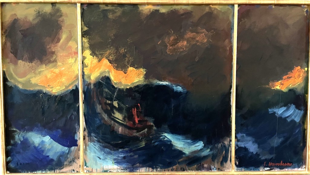 Tidligere har jeg vist Havsteen-Mikkelsens ikoniske malerier af stormen på søen. Adspurgt, om han kendte Genezareth Sø, svarede han: ”Nej, men Atlanterhavet kender jeg.” Se nedenstående maleri, som har hængt på Schæffergaarden i Gentofte. Gad vide, hvor det findes i dag? Foto: Claus Jensen.
