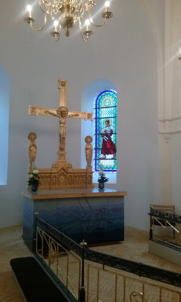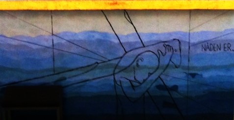 Salmedigteren Simon Grotrian blev inviteret til at skrive en tekst til kunstværket. Han løste opgaven på fineste vis med de kun to ord: “Nåden er”. Det er ren nåde, at vi har den gode hyrdes omsorg, og det er ren nåde, at han giver os sit liv. Det er ikke en fortælling i datid, men pure nutid. Fotos: Claus Jensen.