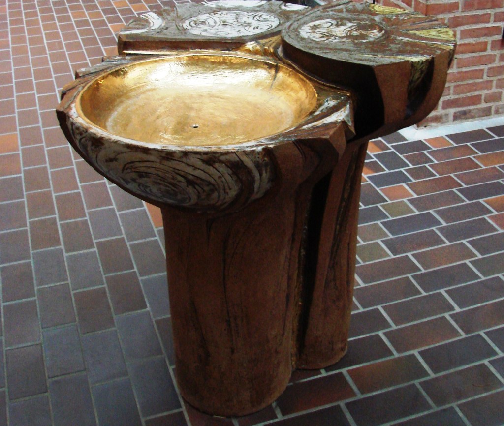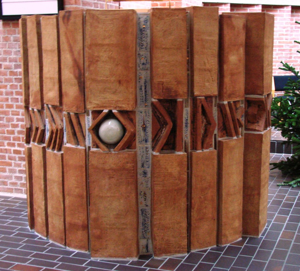 Tue Poulsens keramiske døbefont i Vangede kirke er eksempelvis udformet som et træ med forgreninger for treenigheden som det livstræ, dåbsbarnet indpodes i, – og kirkens prædikestol fremtræder som indfatning om den store perle, der symboliserer evangeliet som et kostbart fund.