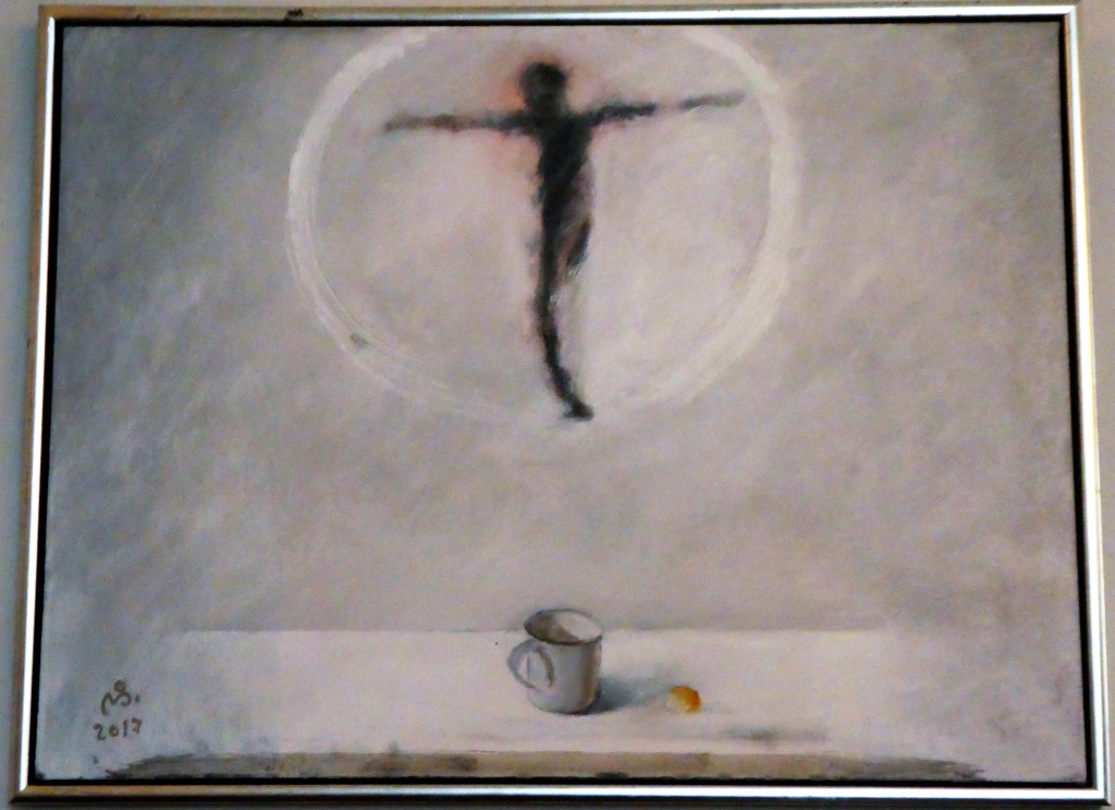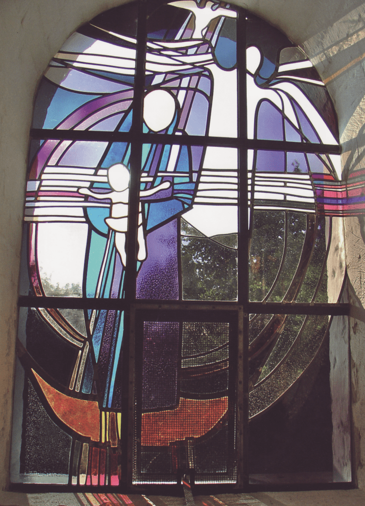 Her viser jeg eksempler på hans glaskunst, hans skulpturkunst og hans maleri: Først “Mariaruden” fra 2003-5 i den middelalderlige Grandløse kirke, dernæst skulpturen “Lyttende Jesus” fra o. 1980 og sidst hans maleri i Øde Førslev Kirke med kruset som nadversymbol, malet så sent som 2017. Fotos: Claus Jensen.