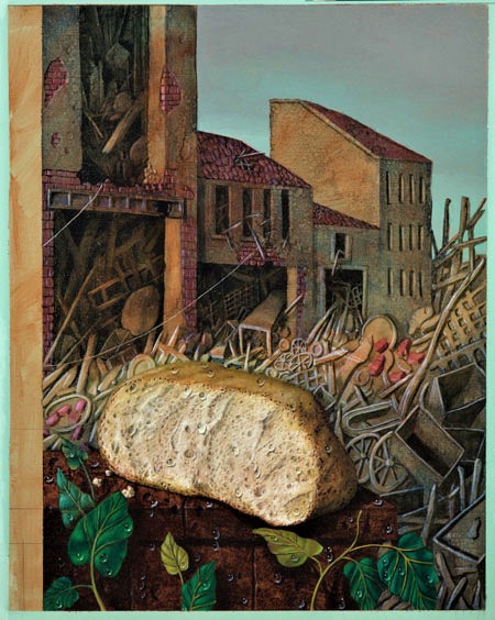 Til denne søndag vælger jeg et kunstværk, som ikke bor i en kirke, men som er et stærkt religiøst billede. Det viser et stykke brød på en baggrund af ødelagte hjem. Det er det uforglemmelige værk “Krig og brød”, som i 2006 blev skabt af Jørgen Bobjerg (1940-2009). Billedet ægger vore forestillinger: Er et måltid brutalt blevet afbrudt af militære angreb? Har nogle måttet flygte uden tid til at tage noget med sig? Kommer de nogensinde tilbage? Vi ser en tragedie, men samtidig ligger brødet altså der i forgrunden og lyser indbydende, sakralt, mytisk, kranset af spirende, grønne planter. Brødet er et tegn på tro, håb og kærlighed fra vores gavmilde skaber, og det fortæller ukueligt om et muligt liv med omsorg og fællesskab.