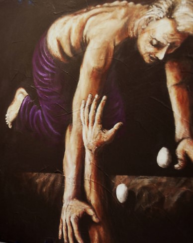 Det billede, jeg har valgt til dagen, er udsnit af et surrealistisk maleri, som måske refererer til påsken med de to spejlvendte æg, der måske er opstandelsessymboler. Billedets mørke afgrund er et fysisk eller åndeligt dødsrige, og billedet kan handle om ethvert menneskes frelse fra mørket, ikke ved egen kraft, men ved at blive løftet af den stærkere, som sætter sig selv på spil. Jan Jochims Nielsen er kendt som eksrocker og kunstner med det på min hjemmeside tidligere viste nadverbillede fra 2013 i Enner Mark Fængsel som hovedværk.