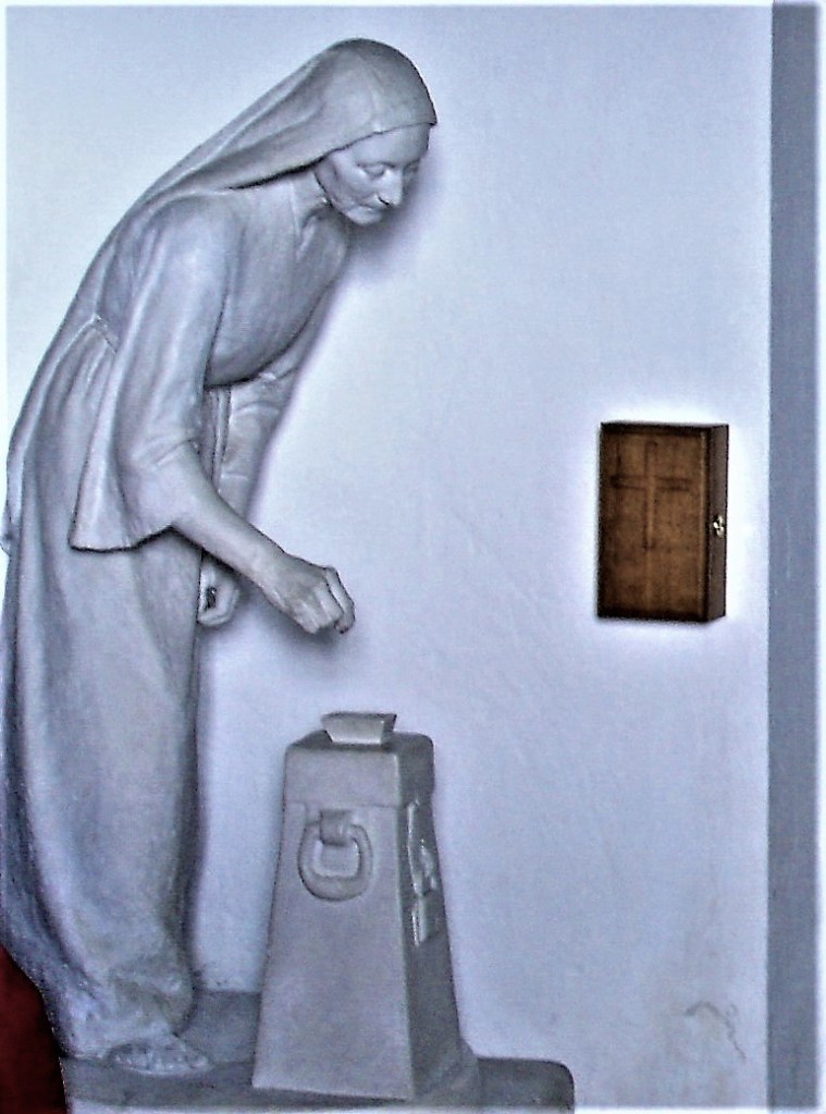 Den fattige enkes skærv er repræsenteret i mindst 4 forskellige danske kirkers udsmykning. Mest kendt er Elias Ølsgaards (1873-1864) smukke bronzeskulptur fra 1957 uden for Johanneskirken i Aarhus, hvor Ølsgaard boede det meste af sit liv (se nederst i opslaget) Den spinkle kvinde med det sorgmærkede ansigt er skildret med ynde og værdighed. Billedhuggeren regnede selv den følsomme figur for sit mesterværk. Imidlertid har skulpturen en forgænger i en Elias Ølsgaards barndomskirke: Kollerup Kirke ved Jelling. Til denne middelalderkirke forærede Ølsgaard allerede i 1953 sin skulptur. Den fattige enke står i Kollerup i hvidmalet bronze (!?), appellerende placeret ved siden af den korssmykkede kirkebøsse ved udgangen. Come on!