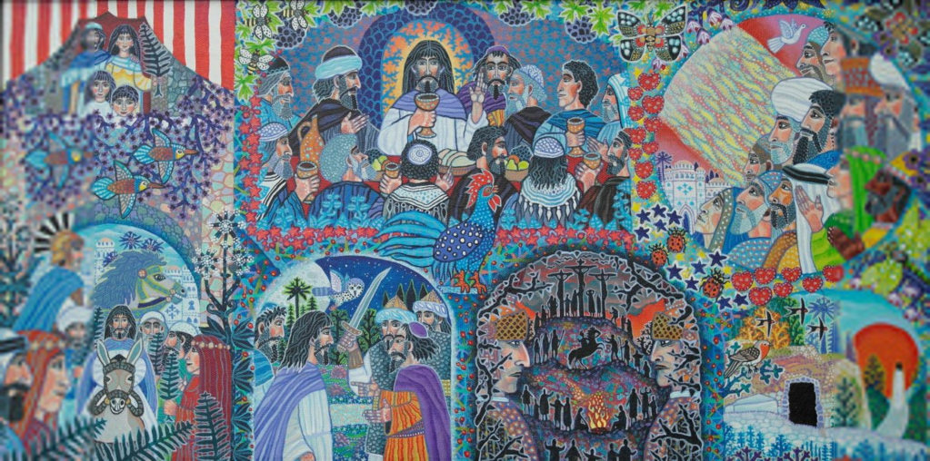 Det billede, jeg har valgt til dagen, er udsnit af et surrealistisk maleri, som måske refererer til påsken med de to spejlvendte æg, der måske er opstandelsessymboler. Billedets mørke afgrund er et fysisk eller åndeligt dødsrige, og billedet kan handle om ethvert menneskes frelse fra mørket, ikke ved egen kraft, men ved at blive løftet af den stærkere, som sætter sig selv på spil. Jan Jochims Nielsen er kendt som eksrocker og kunstner med det på min hjemmeside tidligere viste nadverbillede fra 2013 i Enner Mark Fængsel som hovedværk.