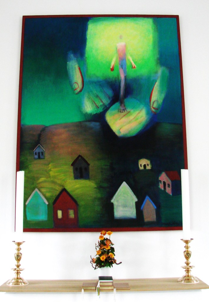 Mennesker er ikke ens. For mit vedkommende er der mental hjælp at hente ved at knytte et (indre) billede til Fadervor, et billede, der visualiserer trygheden. Min inspiration er fundet i Arne Haugen Sørensens alterbillede ”Frygt ikke” fra 2014 i Vedsted Kirke, Birkelse, Jammerbugt. Arne Haugen Sørensen er kendt for sine opstandelsesbilleder, hvor en afdød ved Guds store hånd løftes fra graven op i lyset. Under kunstnerens forberedelse til maleriet i Vedsted Kirke spurgte menigheden kunstneren, om Guds hånd kun var for de døde. Naturligvis ikke. Resultatet blev dette vidunderlige aftenbillede af Guds kærlige hænder som et lys, der omslutter den enkelte i det lokale landsbysamfund. Arne Haugen Sørensens budskab er angiveligt: ”Frygt ikke. Du er i gode hænder. Men livet er heller ikke det værste, man har.” Jeg forestiller mig de mange små hjem med mennesker, som trygt kan gå til ro med Fadervor som dagens sidste ord. Hvad året end bringer, Godt Nytår med Fadervor! Foto: Claus Jensen.