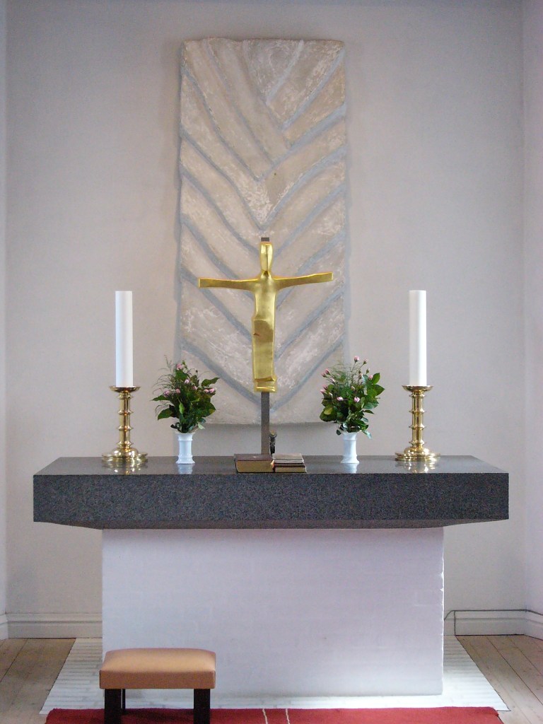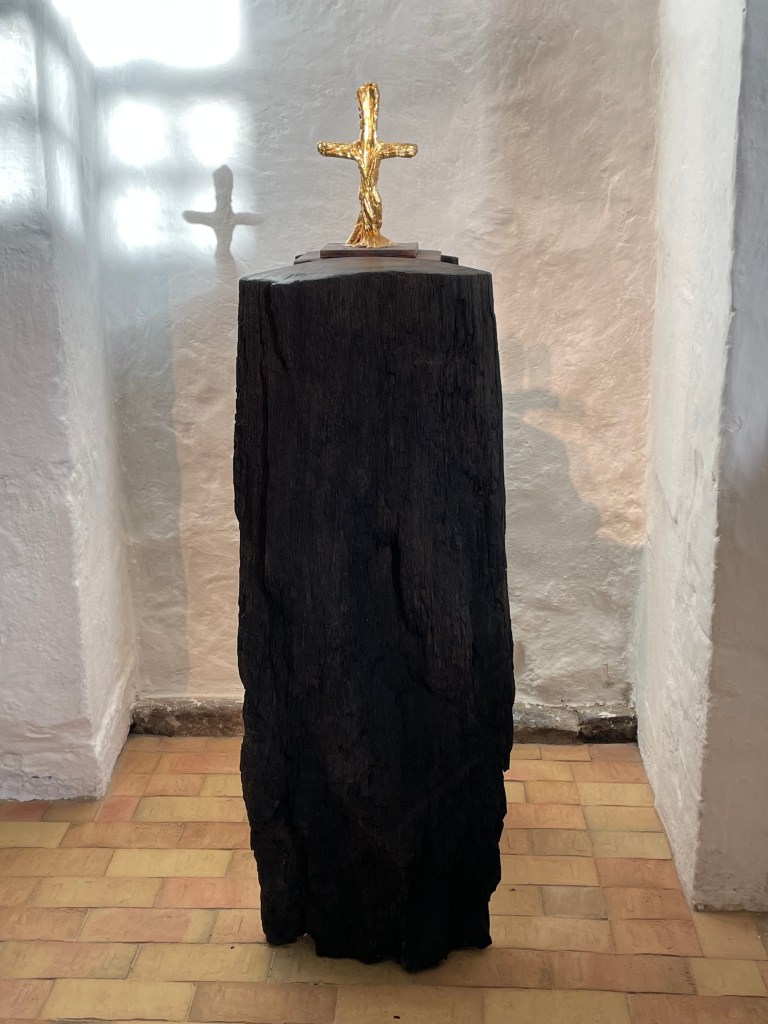Allerede ved indgangen i kirkerummet mødes vi af Maja Lisa Engelhardts lille forgyldte bronzekrucifiks, der står som en levende vækst med aftegning af oliventræ, værdigt placeret på en sokkel af moseeg.
