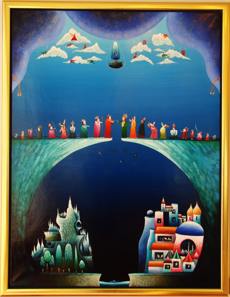 Brorsons uopslidelige, lovprisende salme ”Op al den ting, som Gud har gjort” blev skrevet 1734, altså midt under enevælden, og her formulerede Brorson som bekendt, at end ikke verdens magthavere kan skabe liv. Flere stykker visuel dansk kirkekunst er opkaldt efter netop denne salme, bl.a. et maleri i Sejs-Svejbæk Kirke med titlen: ”Om skabelsen – Gik alle konger frem på rad i deres magt og vælde / de mægted ej det mindste blad at sætte på en nælde”. Det valgte maleri fra 2000 er udført af Stig Weye (f. 1946) i hans karakteristiske surrealistiske og humoristiske stil, som vi især kender fra en omfattende fabulerende udsmykning i Grindsted Kirke. Maleriet er opbygget med en bue, der hvælver sig over et dramatisk landskab og et byprospekt med en lille dansk kirke øverst. På buen står dukkeagtige konger i geled på hver sin side af en kløft, livets rand. De forreste konger rækker frem mod hinanden hhv. en ydmyg plante og et grønt blad, som de naturligvis ikke magter at fæstne, så lidt som de kan bygge bro over livets grænse. Derunder flagrer fugle i det store rum. Over kongernes scene trækkes et forhæng til side, så himlen åbenbarer sig med skyer, henrykte engle og et livstræ i centrum. “Halleluja, vor Gud er stor! – og Himlen svare: Amen”. Foto: Claus Jensen.