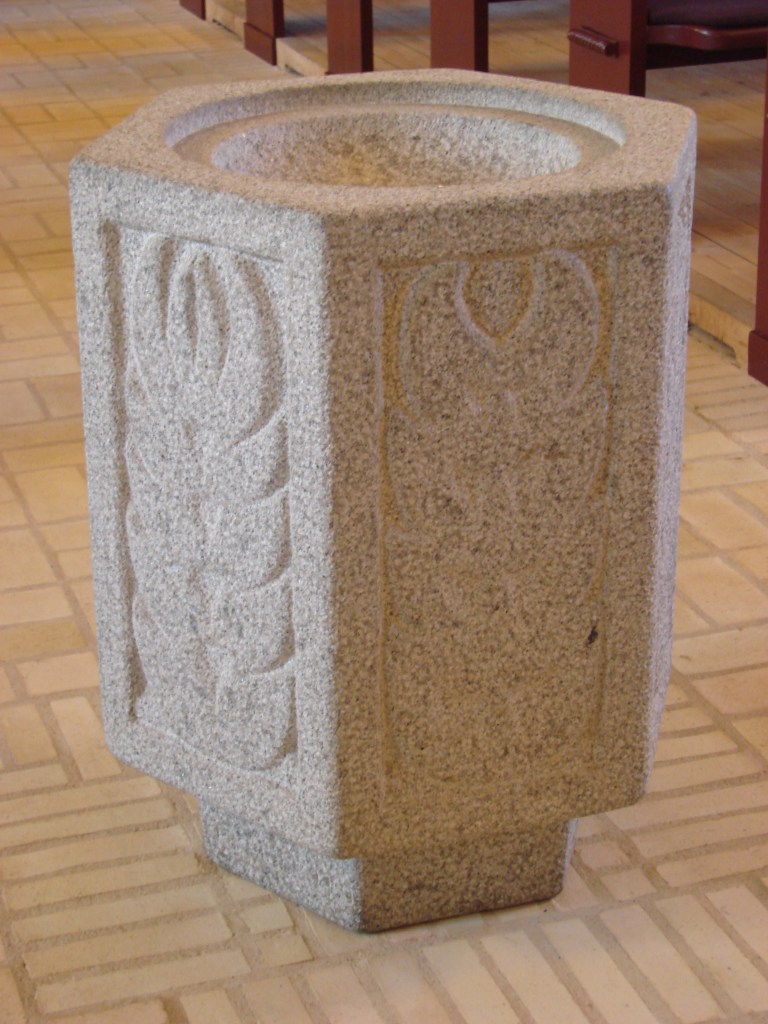 Der er gammel tradition for at forbinde Jesu ord om levende vand med den kristne dåb, hvor Helligånden tilsiges som dåbsgave. Dåbens betydning fremhæves af Luther, og den meget værdsatte billedhugger Laila Westergaard (f. 1964) har i anledning af det lutherske reformationsjubilæum i 2017 skabt en døbefont ved navn ”Kilden”. Kunstneren afbilder her det strømmende, livgivende vand, som på fontens relief bærer en hel fiskestime, ikke kun en enkelt fisk: det ældgamle Kristussymbol. Motivet giver på begge sider af fonten en oplevelse af vandets oplivende, friske brusen. Laila Westergaard har dertil – efter middelalderlig tradition – på døbefontens ydre udformet dåbsvandet i rækker af bølger. De bølgende, koncentriske cirkler, der som ringe spreder sig i vand, lader os ane det uendeligt ekspansive ved evangeliet. Laila Westergaard lægger vægt på det fællesskabsstiftende ved dåb og nadver, men vel at mærke ikke som fællesskaber der lukker sig om sig selv. – Laila Westergaard har efterhånden skabt 6 vidt forskellige døbefonte. Heraf har ”Kilden” nu fast adresse i Lindevangskirken i København, hvor foto er taget. Laila Westergaard har om sit arbejde med granitfonte skrevet: ”Når jeg lægger min hånd på en romansk døbefont, gør det mig lykkelig. Det giver mig en fornemmelse af sammenhæng og en forbundethed med det menneske, der på trods af at være indfældet i en anden tid end min har bygget fonten og har måttet kæmpe med granitten og livet som jeg.” Citat fra den smukke bog om Laila Westergaards Kunst ’Levende stene’.