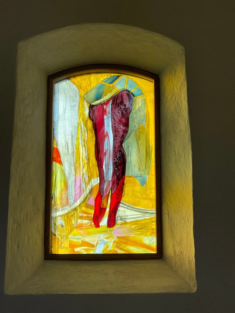 Død og nyskabelse er uadskilleligt forbundne. Her hvor lyset vælder ind fra syd, gløder Maja Lisa Engelhardts nye rude som en påskevision i blodrødt, snehvidt, himmelblåt og solgult: Kristus har rejst sig fra graven og er som opstanden på vej ud i vores verden.