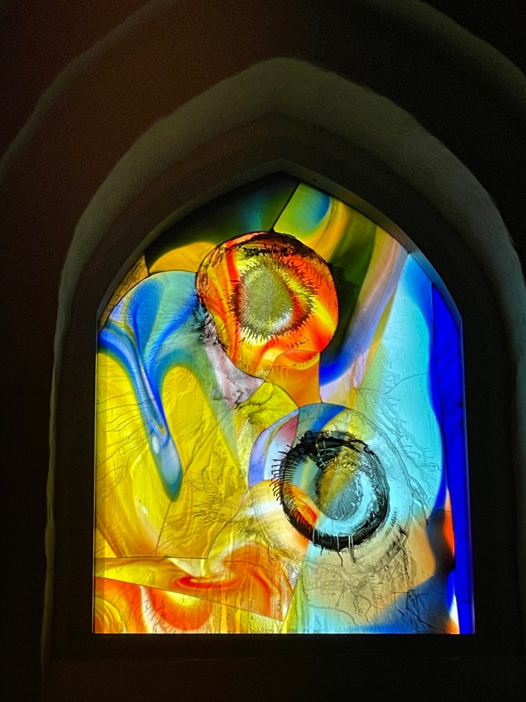 Til tårnrummet, som forhåbentlig engang kommer til at stå i åben forbindelse med kirkeskibet, har Maja Lisa Engelhardt endvidere skabt en festlig glasmosaikrude, hvis tema er det dansende lys fra sol, måne og nordlys.