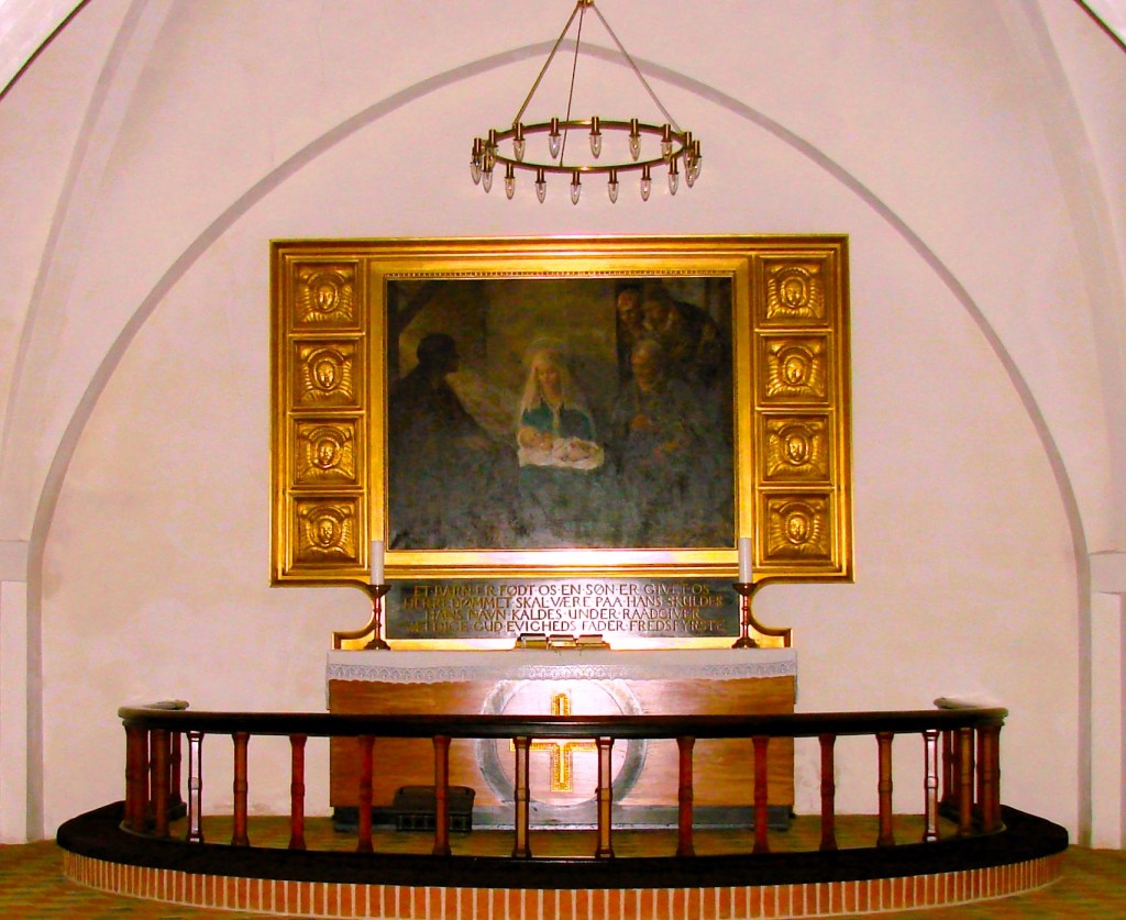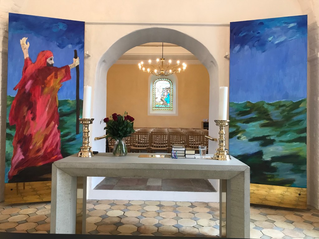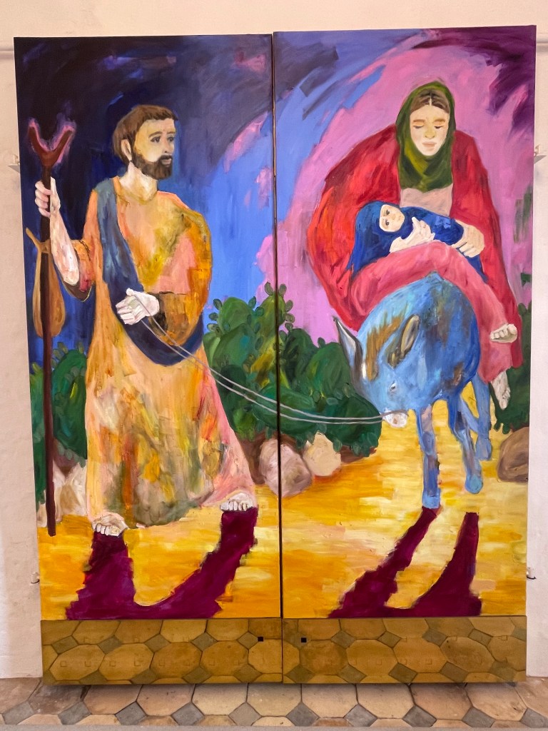 Dansk kirkekunst byder på en del, især middelalderlige, værker med ’Barnemordet i Betlehem’ som det grumme motiv og mange flere smukke billeder af ’Flugten til Egypten’, hvor en gående Josef trækker æslet med Maria og det lille barn. Dertil har maleren Lise Malinovsky (f. 1957) i 2018 føjet sit store maleri ’Flugten til Egypten’ i Hammel Kirke, Favrskov, – i anledning af en ombygning, hvor en skillevæg bag alteret blev ombygget til en fløjdør med mulighed for at forlænge kirkeskibet. Malinovsky kan siges at ramme Matthæus’ teologiske intention rent ved at forbinde Moses- og Jesushistorier. Set fra kirkens skib viser maleriet på den åbne fløjdør en scene fra hebræernes udvandring fra Egypten, nemlig Moses’ deling af Det røde Hav. På den lukkede dør ser vi billedet af Flugten til Egypten. Det er en kongstanke i Matthæusevangeliet, at Kristusevangeliet svarer på Israels forhåbninger og profetier, hvorfor han lader Jesushistorien gennemspille temaer fra Moseshistorien: Som Mosesbarnet var efterstræbt af den onde Farao, var Jesus truet af kong Herodes, og som Moses med hebræerne i sit følge kaldtes ud af Egypten, kaldtes Jesus efter udlændigheden i Egypten tilbage til Israel. Begge motiver har dertil en egen aktualitet ved at skildre mennesker på flugt. Lise Malinovsky er uddannet på Kunstakademiet og har vakt opsigt som en af Danmarks stærkeste kolorister med ekspressivitet og sensualitet i sine værker. Hendes værker har ofte en merbetydning i form af et tankevækkende eksistentielt indhold. Foruden Hammel Kirke har Malinovsky udsmykket Tyrsted Kirke ved Horsens (2016 og senere) med meget seværdige, symbolrige malerier. Foto: Claus Jensen.