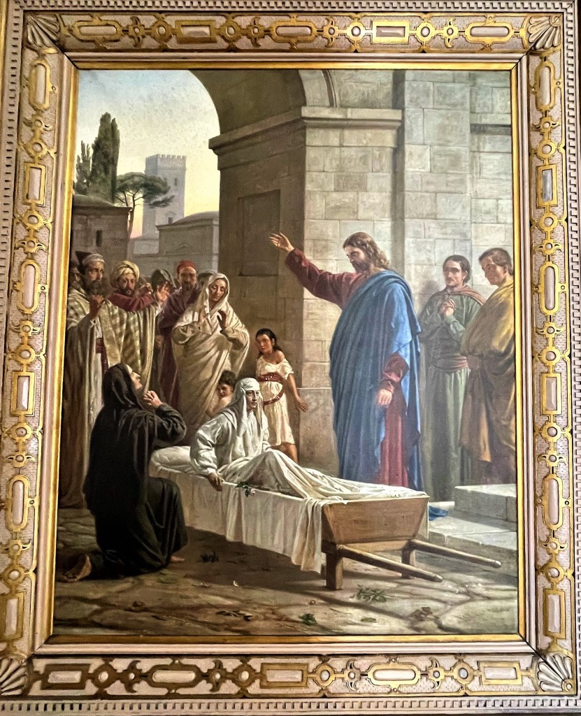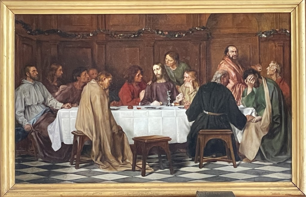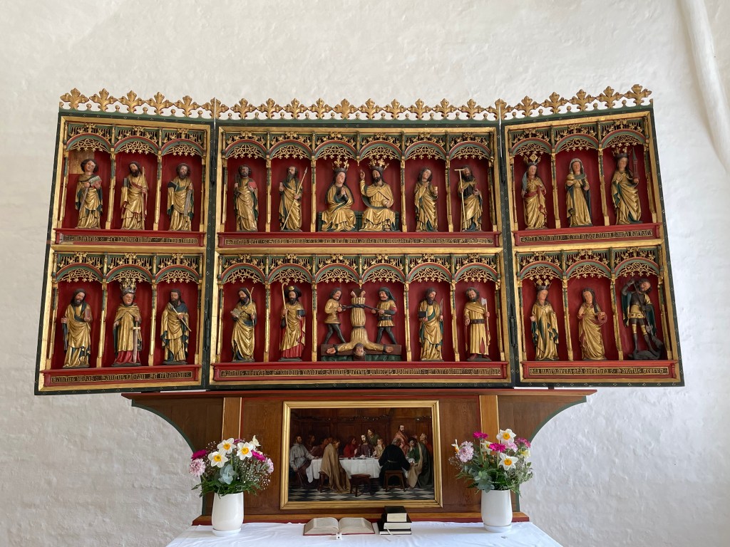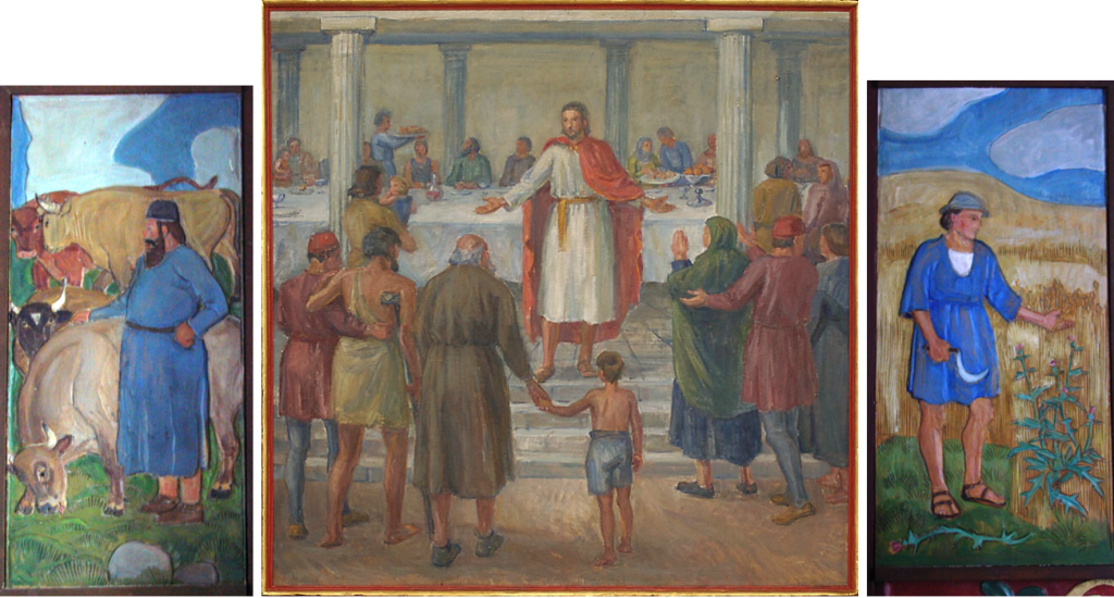 Ikke mange kunstværker tilbyder direkte fortolkninger af lignelsen om ”Kongesønnens bryllup” – bortset fra J. F. Willumsens berømte museumsstykke i Frederikssund, som vi dårligt kan bruge her på grund af dets satiriske skildring af det kongelige par. Lukas bringer med ”Det store gæstebud” (2. sønd. eft. trin.) en blidere version af lignelsen, som ikke er omgærdet af krigshistorik, og Lukas’ udgave har appelleret til flere kunstnere, især i det grundtvigske miljø. Flere er vist på denne hjemmeside gennem foregående år. Her viser jeg nederst Troels Triers version fra 1952 i Vester Assels Kirke, Morsø. Her er der også på altertavlens fløje malet billeder af personer, som afviser invitationen. Foto: Claus Jensen.