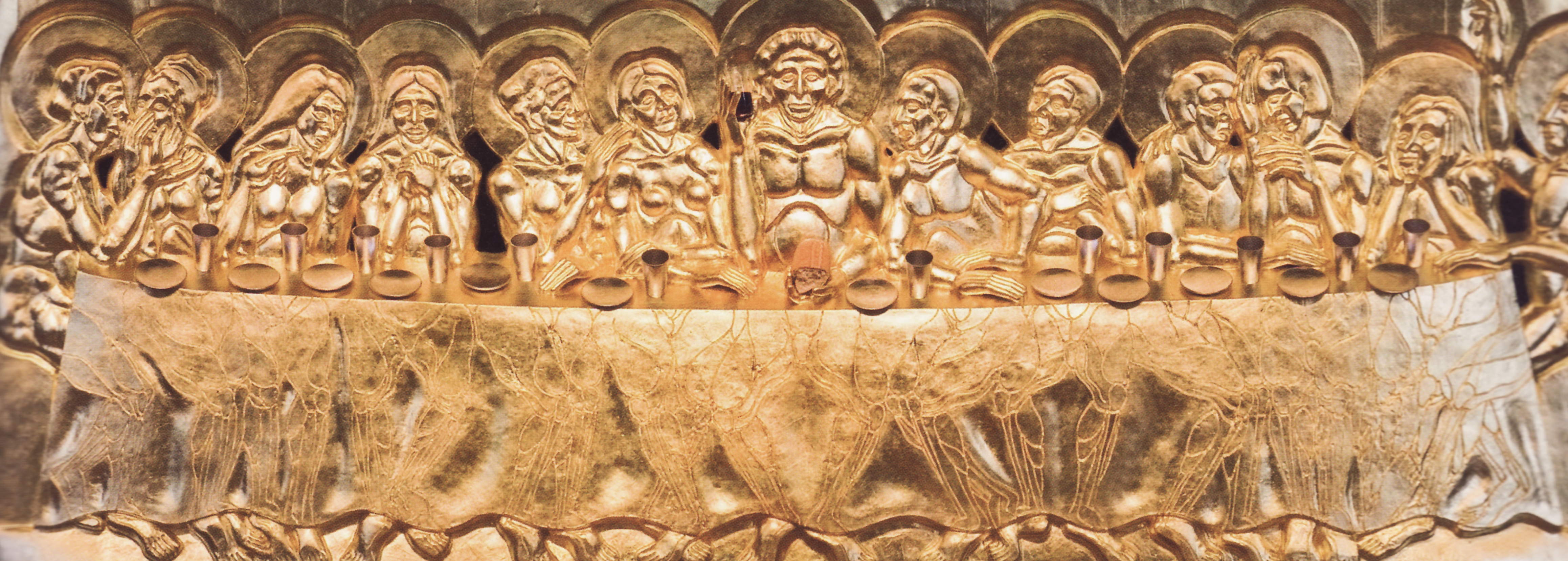 Jeg vælger i dagens anledning Bjørn Nørgaards gyldne taffel-relief i Christianskirken i Fredericia, angiveligt skabt allerede i 2007 som led i den store udsmykning, som Bjørn Nørgaard selv gav titlen ”Du skal elske din fjende”. På langsiden er festens midtpunkt, som vi tolker som Kristus, skildret som en multietnisk løve-mand, der løfter glasset med ægte vin for sine gæster af forskelligt køn. For egen regning har flere iagttagere fået øje på den finurlighed, at festdeltageren ved venstre bordende minder om Dronning Margrethe. I alt fald er det forbilledligt, når også kongelige personer går i synagogen og kirken og lader sig tiltale af den højere instans.