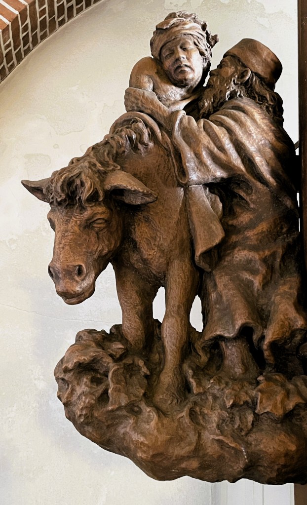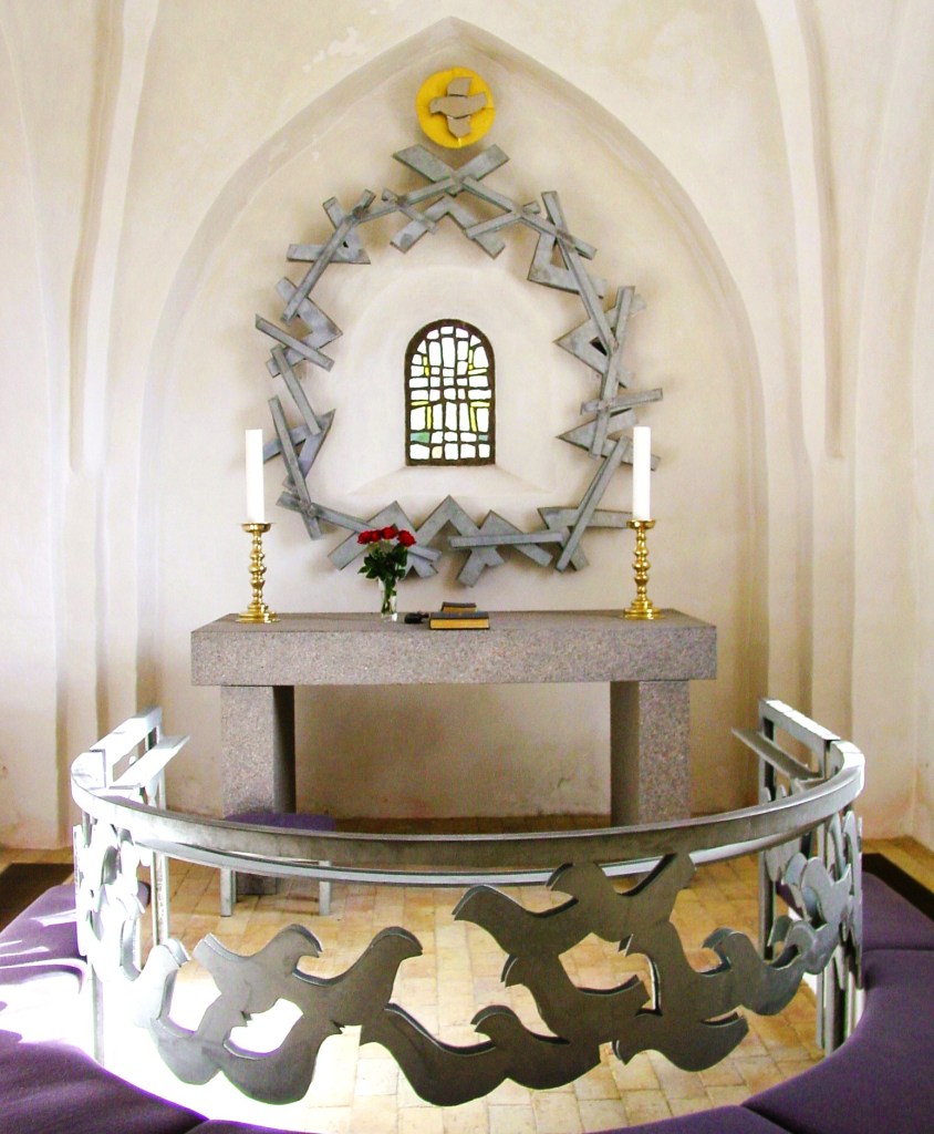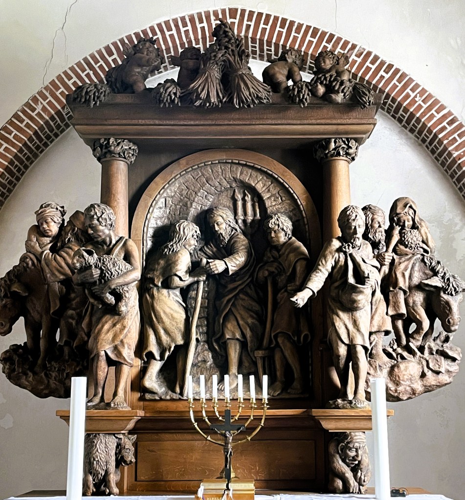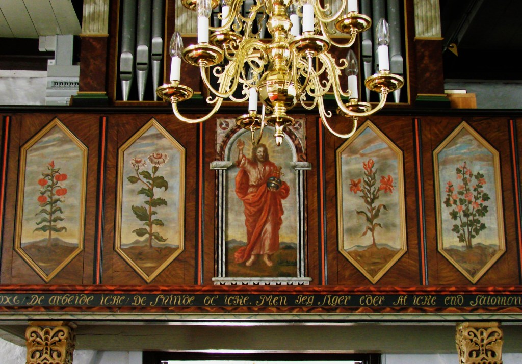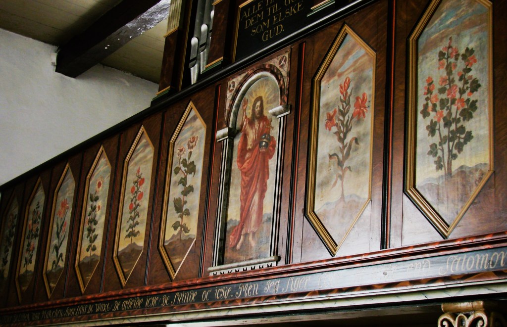 Dagens tekst, hvor Jesus peger på himlens fugle og markens blomster, er direkte motiv for kirkeudsmykninger af Johan Thomas Skovgaard og af John Sparre Christensen, som tidligere vist på hjemmesidens opslag til foregående år. Denne gang ser vi en del af netop denne søndags bibelcitat malet på et 1700-tals pulpitur i Bredstrup Kirke ved Fredericia. Her har maleren, hvis navn jeg ikke kender, omhyggeligt malet forskellige prægtige blomstersorter, som overgår den kongelige galla i pragt. I centrum er Kristus åbenbaret som verdens frelser – Salvator mundi – med den ene hånd løftet til velsignelse. I den anden holder han jordens bold, kronet med kors og opdelt i de klassiske verdensdele Europa, Asien og Afrika. Omkring ham bekræfter de 12 blomsterpanelers skønhedsåbenbaringer, at der er grund til tro og glæde. Trods lysreflekser kan citatet fra Bjergprædikenen nok identificeres. Foto: Claus Jensen.