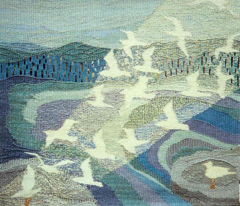 Fuglenes liv er ofte fastholdt i glædebringende kunst, også kirkekunst. Denne gang viser jeg et fint stykke tekstilkunst med titlen ‘Hav, lys og måger’. Det er et sindrigt vævearbejde med blide blåhvide nuancer, skabt i 2015 af tekstilkunstner Birgitte Nielsen, som siden 1974 har farvet garn og vævet. Birgitte Nielsen har atelier på Thurø, hvor hun arbejder med både natur og bibel som inspiration.