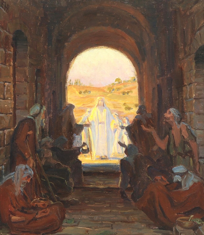 Andre billedtolkninger af dagens tekst koncentrerer sig typisk om den takkende samaritaner for Jesu fødder. Maleren Ellen Hofman-Bang (1879-1971) har derimod skildret den indledende situation, hvor de spedalske endnu er fanget i deres mørke, – måske et motiv som alt for mange også i overført betydning kan identificere sig med. Det er øjeblikket, hvor håbet fødes, idet Jesus manifesterer sig som et Guds lys ’for enden af tunnelen’. Den veluddannede fynske maler Ellen Hofman-Bang var værdsat i sin samtid, hvor hun især malede dualistiske og apokalyptiske åbenbaringsmotiver med fokus på Gudsrigets dramatiske indbrud i verden. Flere af hendes alterbilleder hænger stadig i danske kirker, fx i Skt. Peders Kirke i Randers, andre udstilles på kunstnerindens fødegård Hofmansgave på Nordfyn. En eftertid har ofte fundet hendes dramatiske stil noget teatralsk. Det billede, jeg her har valgt at vise, er effektfuldt med sin stærke spænding mellem håbløshed og håb, og det er samtidig inderligt empatisk. Det er måske tænkt som et forarbejde? Jeg har set det u. å. i et auktionskatalog, så det er nok i privateje.