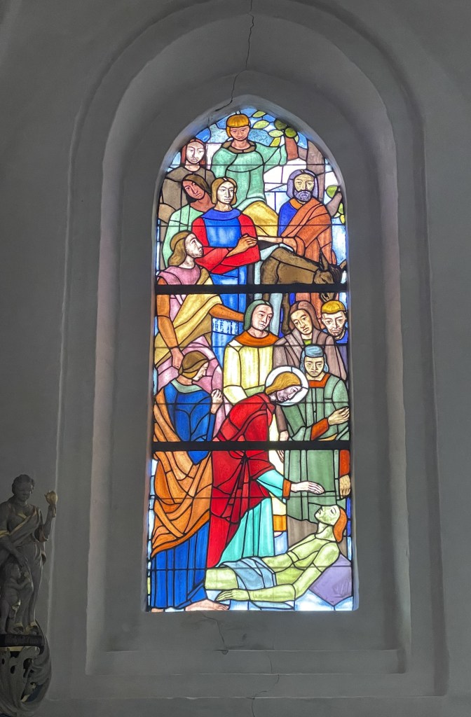 Kigger vi i danske kirker efter billedtolkninger af Jesu dødeopvækkelser, er fortællingen om enkens søn langt mindre hyppig end den parallelle, måske mere yndefulde (?), scene med opvækkelsen af Jairus’ datter. Den store maler og glaskunstner Kræsten Iversen (1886-1955) har dog helliget en af sine store korruder i Stouby Kirke ved Vejle til dette motiv. Kræsten Iversens malerstil er fhv. fri, men når han arbejder i glas, er hans figurer karakteriseret ved tydelighed og klare konturer. De fortællende og figurrige ruder til kirkens kor blev skabt i 1951-52. Jeg bringer dels et nærbillede af vores opvækkelsesscene, dels hele ruden med dens større forsamling af deltagende og antydning af et grønt træ mod blå himmel i baggrunden – måske et paradistegn? Foto: Claus Jensen.