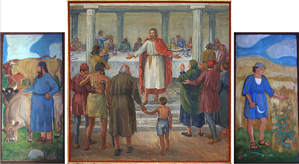 Hvordan afbildes tilgivelsen? Jeg tyr til Arne Haugen Sørensens udtryksfulde kunst i bogen ’Den store passion’. Her har jeg fundet en blandt flere fortolkninger af ’Hjemkomsten’ fra 2011. Den lysfyldte, hjemlige døråbning er betydningsladet her og i flere af kunstnerens værker. I kæmpeværket ’Den store fortælling’ fra 2017 i Aarhus Valgmenighedskirke er døren således ligefrem den strukturerende arketype: Med syndefald og paradistab må mennesket ud ad døren, ud i tilværelseskampen mod mørket, men aldrig går det på sin livsvej uden håb om at blive taget til nåde. Den oplyste dør omkring Kristus er det transcenderende håbs symbol. I Arne Haugen Sørensens frelseshistorie er menneskets slutpunkt dets hjemkomst til det genåbnede paradis. Her står døren til det lysfyldte hjem åben, og håndtrykket – eller omfavnelsen – er tilgivelsens tegn. Den glade hund er med til at illustrere den lykkelige hjemkomst.