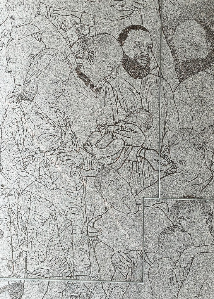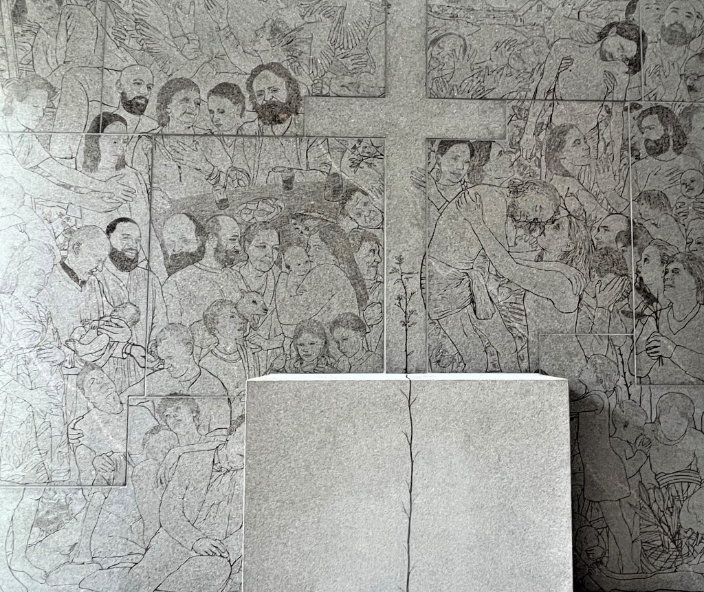 Det valgte billede er et udsnit af Laila Westergaards uendeligt righoldige altertavle fra 2020 i Gødstrup Hospitalskirke ved Herning. Granitrelieffet er, som Dorthe Fogh og Anette Østergård skriver, en “flerstemmig fortælling, som er fortalt med glæde over menneskers fællesskab og samspillet med det guddommelige”. Den tidsmæssige afstand mellem bibelhistorie og nutid er ophævet. I centrum er korset, på hvis højre side vi bl.a. møder døden, omsorg for liget og sorg over afskeden, som deles af mennesker der føler som os. Venstre side er fyldt af levende menneskers gode fællesskab, et fællesskab vi gerne ville se os selv i. Under lyset oppefra og Helligåndens vingefang ses fortolkninger af livet i en menighed: Her er dækket op til nadver eller snarere til Emmausmåltidet, hvor den opstandne selv byder til bords, og her er børn i omsorgsfulde voksnes arme. Yderst tv. ses en indadvendt, højgravid kvinde med hænderne på sin mave. Det kan være Maria, eller det kan være enhver kvinde, der tænker på en forestående fødsel. Bag hendes ryg ses en tidsel, som kan symbolisere fødselssmerten. Et dejligt, fuldbårent barn ved siden af hende bæres af en ældre mand. Det kan være Simeon i templet med Jesusbarnet, eller det kan være nutidens ømme bedstefar, der bærer et barn til dåb, “fyldt af glæde over livets under”…. – Frygt altså ikke! – Nederst i opslaget ses et større udsnit af Laila Westergaards epokegørende kunstværk, men fotos er og bliver en fattig erstatning for besøg i dette kirkerum. Fotos: Claus Jensen.