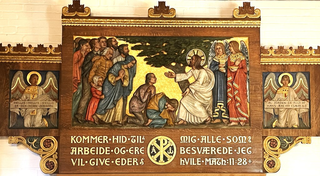 Langt de fleste visuelle fortolkninger af ordet “Kom hid til mig” – ikke kun i Danmark – står i gæld til Bertel Thorvaldsens frontale statue fra 1821 i Vor Frue Kbh. Thorvaldsens klassiske skulptur er kopieret, afstøbt og citeret i så mange malerier, at den er svær at abstrahere fra. I Taastrup Nykirke er Kristus undtagelsesvis fremstillet i profil, så vi ser, hvordan han tv. foran sig har sine trætte og besværede medmennesker af alle aldre, og th. bag sig har Guds Riges personale, englene, med nadvergaverne som pant, lige som tavlens fløje viser engle, hvis skriftbånd refererer til nadverritualet. At knæle under modtagelsen af nadveren er et kropssprog for at finde hvile fra og finde hvile i: at finde hvile fra den præstationsbedømmende hverdag og finde hvile i, at vores liv er dyrebart og meningsfuldt i Guds øjne – sammen med de andres. Den festlige tavle i dekorativt bemalet skønvirkestil er i perioden 1902-1918 skabt af C.N. Overgaard (1851-1929). Fotos: Claus Jensen.