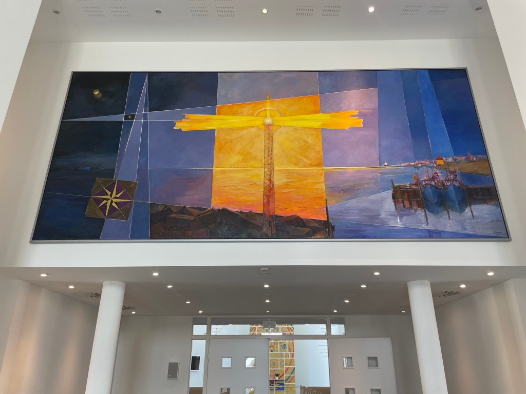 Et nyere eksempel på en kirkeudsmykning med et træ som motiv er John Kørners meget høje og lette vægmaleri i Østerhåb Kirke ved Horsens, malet 2012. Angiveligt var Kørner kirkeligt set forholdsvis forudsætningsløs, men det samme gjaldt ikke kunstnerens mor, der med tanke på Salomons tempel foreslog ham at vælge et cedertræ, og det skal mor ikke have utak for. Østerhåbs cedertræ er både stedsegrønt og lysåbent, så vi også ser himlens fugle, som kan søge ly mellem grenene. Det vises nederst i mit opslag på hjemmesiden https://kirkekunst.net/Kunst . Foto: Claus Jensen.